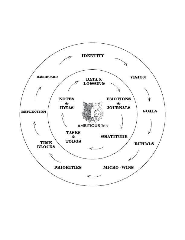 The Ambitious 365 Operating System is your personal command center — blending identity, vision, goals, rituals, time, and reflection into one connected ecosystem.